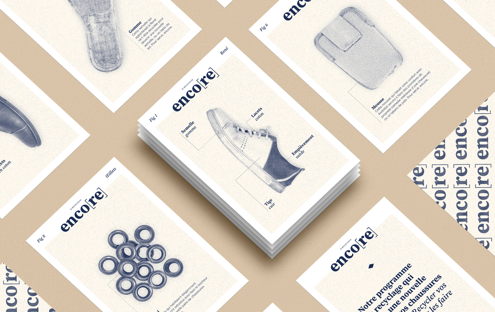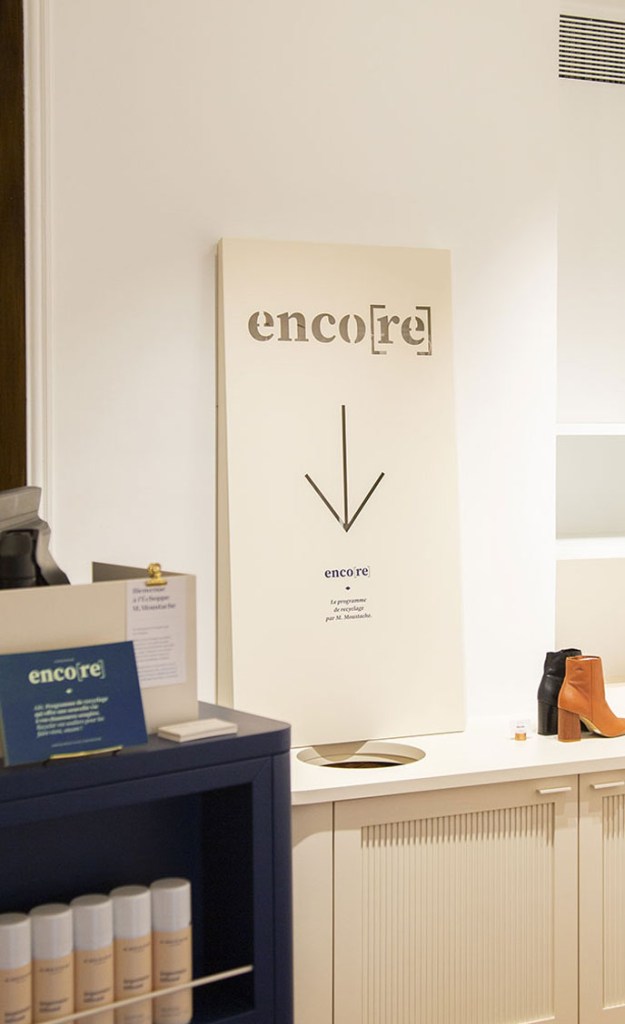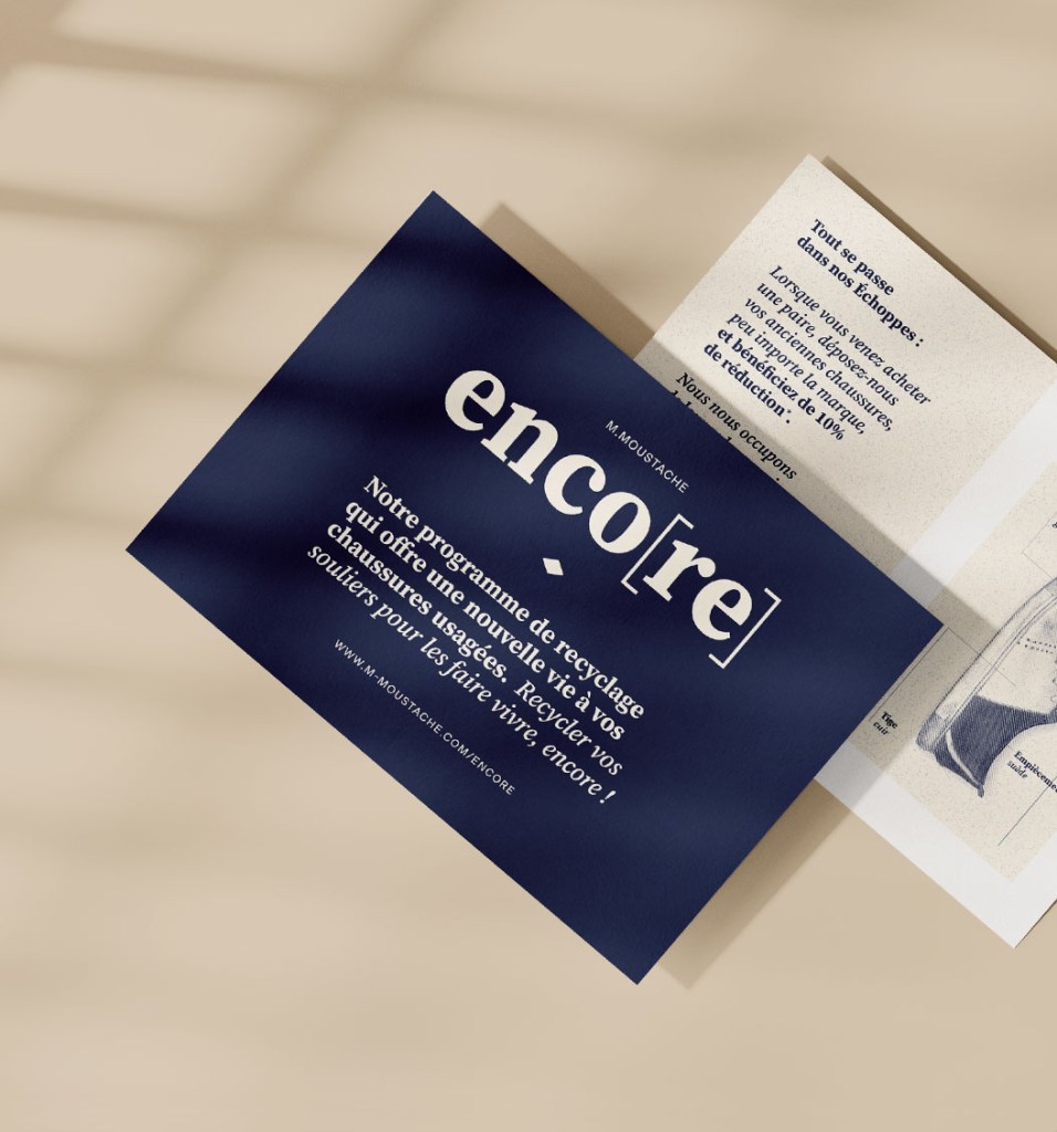 Création de la communication du programme de recyclage par M.Moustache, marque française de chaussures.